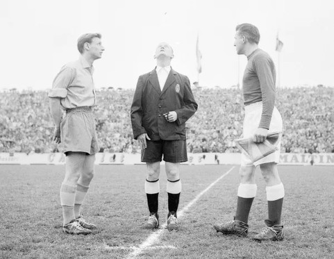 L’arbitre Buchmüller lors du coup d’envoi de la finale de la Coupe de Suisse 1955: